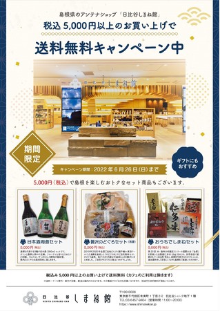 日比谷しまね館では、5,000円以上お買い上げのお客様の送料無料キャンペーンを再開し、6月26日受付分まで期間延長することといたしました!