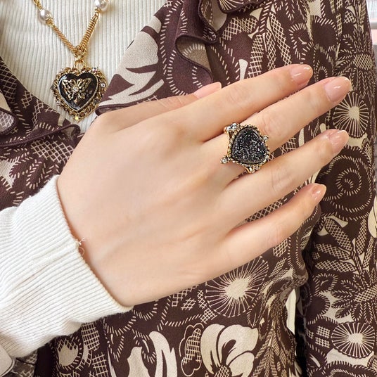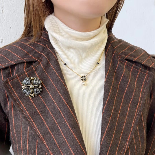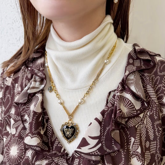 ハートモチーフのネックレスは、キルティング風のテクスチャーと蝶がアイコニックなデザイン。ゴールド×ブラックのモダンなカラーリングがポイントのクローバーモチーフのブローチとハートリングは、カットガラスやパールが華やかさを添えます。