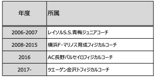 レイソルS.S.青梅ジュニア コーチ - 横浜F・マリノス育成フィジカルコーチ - AC長野パルセイロフィジカルコーチ - ツエーゲン金沢フィジカルコーチ