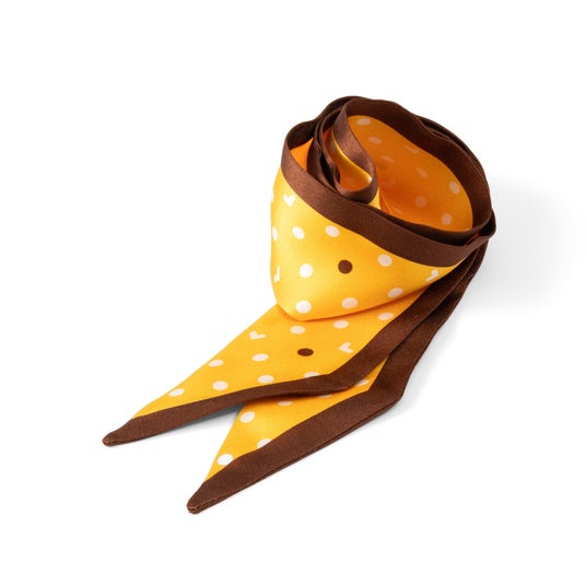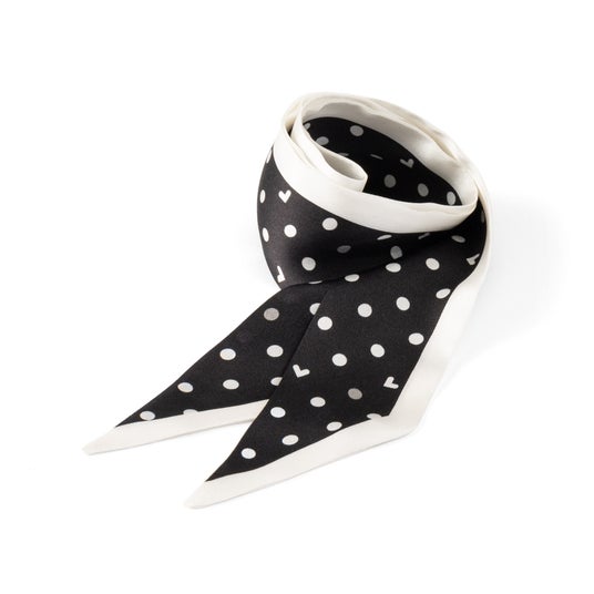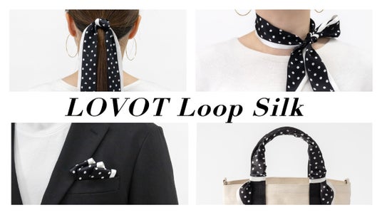 細長いリボンスカーフ「ループシルク」は、シルク100%の素材で、首元やバッグの持ち手に巻いたり、ヘアアクセサリーやジャケットのポケットチーフとしてもアレンジ自在です。シンプルなドット柄の中には、よく見ると隠れ『LOVOT』が施されており、さりげない遊び心を感じさせます。ギフトショッパーも付いているので、プレゼントにもおすすめです。