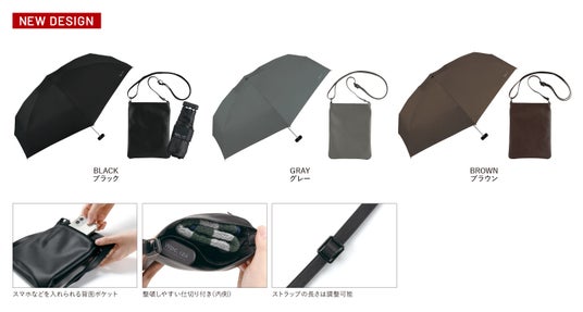 シンプルで上品なレザー調素材を採用した、サコッシュ付き折りたたみ傘。