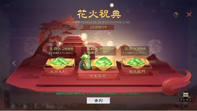 2024年2月9日(金)から2024年2月10日(土)まで、イベント「花火祝典」が開催されます。 イベント期間中の01:00~22:00の間に、指定された水域で船に乗ったり花火祝典を観覧したりすると、玉符を報酬として獲得できます。また、22:00以降は当日の乗船者からランダムに選ばれた3名様に大量の玉符がプレゼントされます。