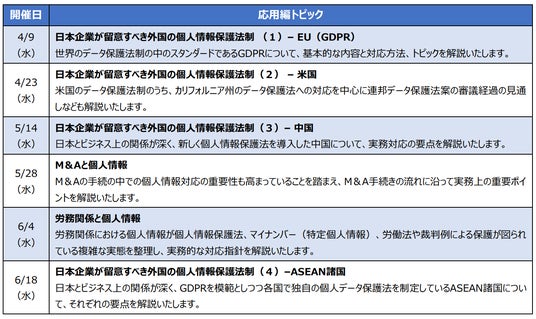 個人情報保護法の規定する内容は多岐にわたりますが、特に実務で頻出となる重要な点については、基礎的な概念から実務的な応用問題まで広く理解することが重要です。本セミナーでは、2024年1月に開催し好評をいただいた個人情報保護法セミナー応用編の講演内容を全面的にアップデートいたしました。昨年実施した基礎編※に続き、応用編では、実務上の問題、さらには他の法領域との交錯、国際的な問題といった事項を詳しく解説いたします。