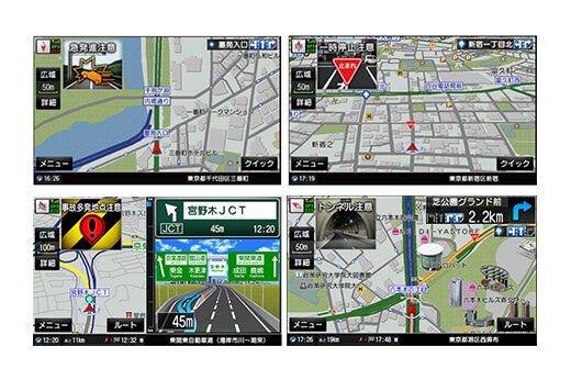 一方通行表示やトンネルアシスト機能、速度注意ゾーンに近づいたら警報が表示される速度制限機能や速度取り締まりエリアのオービス情報等、地点に合わせた支援情報を表示します!
