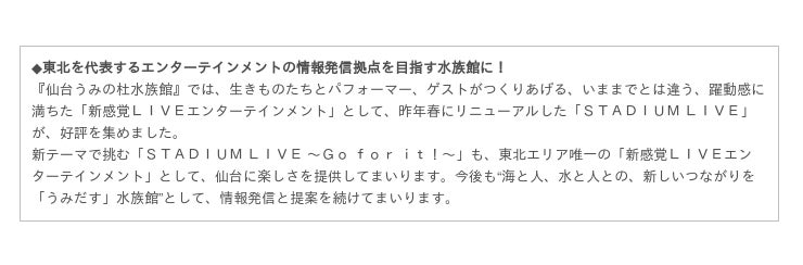 昨年春にリニューアルし、生きものたちとパフォーマー、ゲストがつくりあげる、いままでとは違う、躍動感に満ちた「新感覚LIVEエンターテインメント」として、好評を集めた「STADIUM LIVE」。