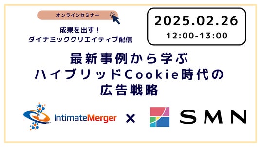 SMN株式会社(本社:東京都品川区、代表取締役社長:原山 直樹、以下SMN)は、株式会社インティメート・マージャー(本社:東京都港区、代表取締役社長:簗島 亮次、以下インティメート・マージャー)との共同ウェビナー「最新事例から学ぶハイブリッドCookie時代の広告戦略」を2025年2月26日(水)に開催いたします。