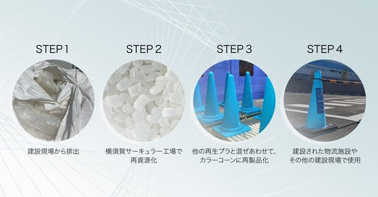 第1弾として、清水建設が施工を手掛けた物流施設(神奈川県相模原市)の建設現場で使用された外壁保護フィルムの残材を回収して、TBMが運営するリサイクルプラント「横須賀サーキュラー工場」にて再資源化し、再生材由来のカラーコーンを製作しました。今回マテリアルリサイクルによって生まれた 500 個のカラーコーンは、完成した同施設の運営備品や清水建設の建設現場用の資材として使用されています。