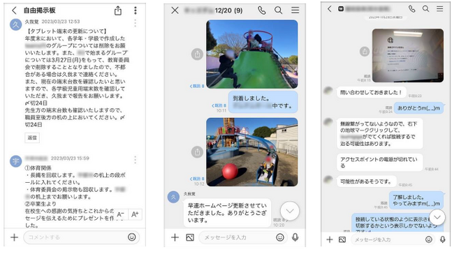 夷隅小学校では校外学習先の様子を学校のホームページへ掲載しています。引率の教職員がデジタルカメラで撮影し、学校に戻ってからホームページを更新する教職員へ写真データを受け渡していました。校外学習は遠隔地で行われるため、データを受け取るまでに一日中教職員が待機する場合もありましたが、「LINE WORKS」導入後は校外学習用のグループトークからタイムリーなデータ共有が実現し、速やかにホームページを更新できるようになりました。待機時間がほぼなくなったことで昨年度に比べて教職員の在校時間が短くなっています。また、同グループトーク内では現地で紛失物やけが人が出た際の情報共有の場としても機能しており、現地での危機管理ツールとしての役割も果たしています。