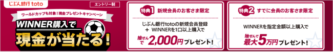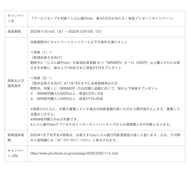 また、すでに「じぶん銀行toto」会員(2022年11月13日までに会員登録済みの方)のお客さまに「WINNER」の購入金額に応じて、抽せんで現金最大5万円をプレゼントします。