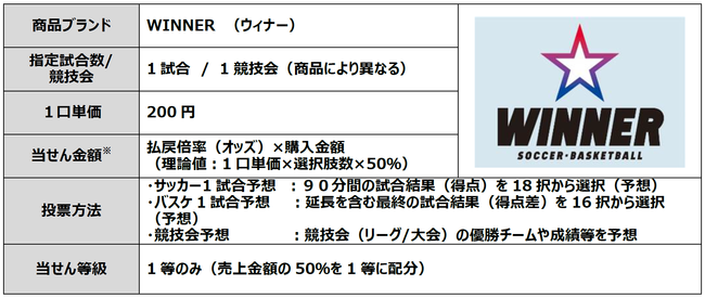 独立行政法人日本スポーツ振興センターが発売する「WINNER」は、1口200円から購入可能で、J.LEAGUEやB.LEAGUEなどの好きな1試合を選んで試合結果を予想するスポーツくじです。競技ファンからくじ好きの方まで気軽に楽しめるくじとなっています。