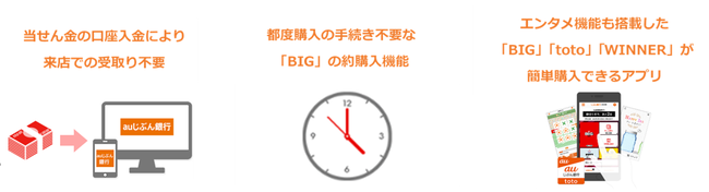 「じぶん銀行toto」は、スポーツくじ「WINNER」「toto」「BIG」が購入できるサービスです。auじぶん銀行口座をお持ちのお客さま(注)は、いつでも簡単にスマートフォン・パソコンから「WINNER」「toto」「BIG」全13種類を購入することができます。当せん金はauじぶん銀行口座へ入金されるため、くじが当たった場合も当せん金を受け取りに行く必要がなく、受け取り忘れることもありません。また、予約購入機能も備えており、都度購入の手続きをすることなく、「MEGA BIG」を含むBIGシリーズのくじを購入することができます。キャリーオーバーが発生した場合に、購入口数を追加する設定も可能です。また、じぶん銀行toto専用のスマホアプリ「じぶん銀行totoアプリ」では、「BIG」「toto」「WINNER」の購入や当せん結果の確認を簡単に行うことができ、運だめしゲーム「TARGET STRIKE」などのエンタメ機能も楽しむことができます。