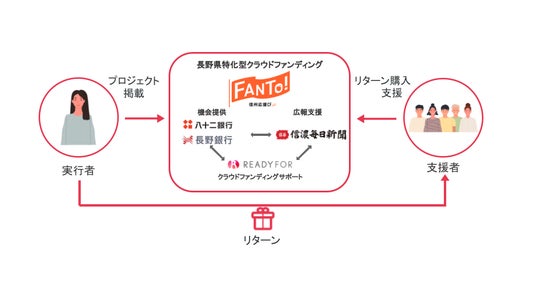 READYFORのクラウドファンディング実施までのサポートに加え、八十二銀行・長野銀行がプロジェクト立ち上げの相談、信濃毎日新聞社が広報活動の支援として信濃毎日新聞で発信いたします。