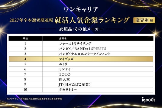 オリジナルグッズを企画製造するアイグッズ株式会社(本社:東京都渋谷区)は、2026年3月、株式会社ワンキャリアが発表した「ワンキャリア 就活人気企業ランキング【業界別編】(27卒本選考期速報)」の【衣料品、その他メーカー】部門にて、第4位を受賞しました。