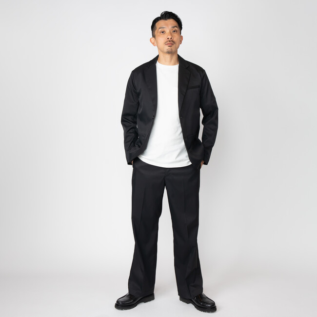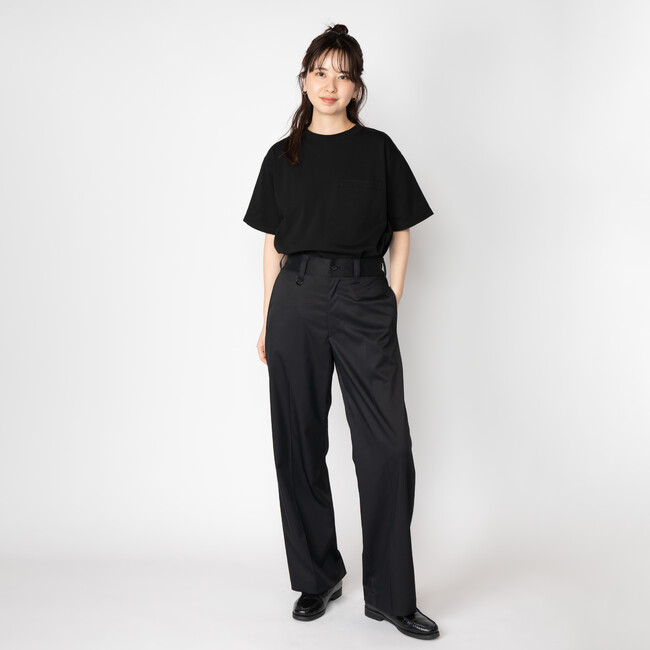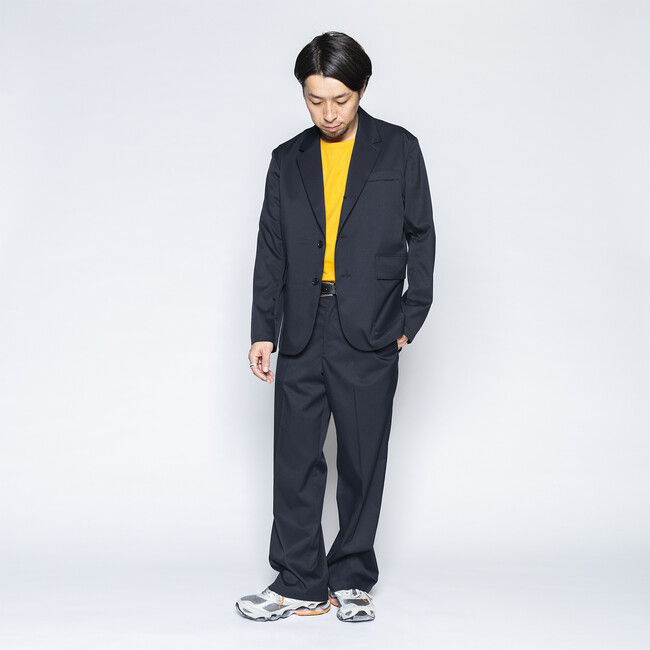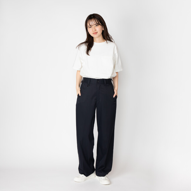 太ももから裾にかけてゆったりとしたシルエットで、背面ゴムによりベルト無しでも着用可能です。ダボつかない適度な太さに仕上げることで、ジャケットと合わせたビジネススタイルやTシャツやシャツに合わせたカジュアルスタイルにも幅広く着回しがききます。