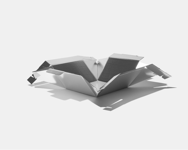 CARTON 2.0のマテリアルは、ダンボール原紙にPETアルミ蒸着フィルムがラミネートされた(株)アイザック製「クールダン」。フィルムの特性と断面の空気層を活かし、ダンボールに「保冷効果」「耐水効果」「防湿効果」を持たせています。廃棄する際は焼却処理可能でダイオキシンが発生しません。