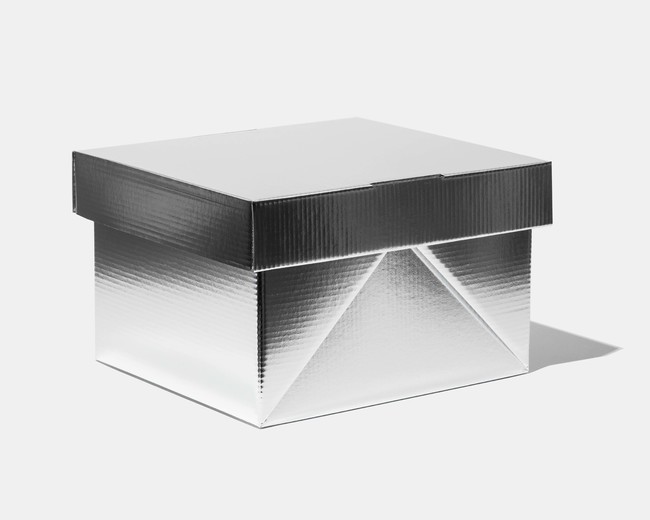 短辺の面はボディとフタの長方形だけが見えるシンプルな構成。シルバーの鏡面に、ダンボールの目方向も横目に合わせているため、横に並べて気持ちがいいデザインです。