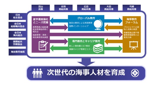 富山高等専門学校(富山県富山市 校長:國枝 佳明)、鳥羽商船高等専門学校(三重県鳥羽市 校長:古山 雄一)、広島商船高等専門学校(広島県豊田郡大崎上島町 校長:逸見 真)、大島商船高等専門学校(山口県大島郡周防大島町 校長:藤本 隆士)及び弓削商船高等専門学校(愛媛県越智郡上島町 校長:内田 誠)は、日本船主協会、全日本船舶職員協会、全日本海員組合、国際船員労務協会及び海技教育機構に、ご参画・ご協力いただき、「次世代の海洋人材の育成に関する事業」を実施しております。