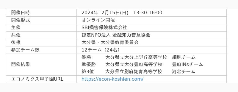 SBI損害保険株式会社(本社:東京都港区、代表取締役社長:小野尚、以下「SBI損保」)は、2024年12 月15日(日)、「第19回全国高校生金融経済クイズ選手権『エコノミクス甲子園』 大分大会」(以下「大分大会」)を開催しました。