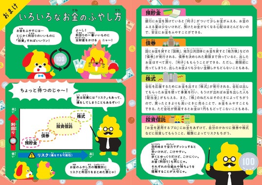 冊子の巻末では、いろいろなお金の増やし方を紹介。預貯金だけでなく、リスクに応じた増やし方があることをうんこ先生らがわかりやすく伝えています。
