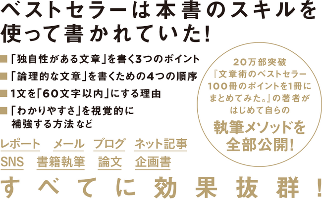 本書では、20万部突破『文章術のベストセラー100冊のポイントを1冊にまとめてみた。』の著者2人が、自らの執筆メソッドをはじめて公開。いままでの執筆経験や文章のプロのノウハウをもとにした、文章の基本ルールと文章を書く上で大切な心構えについての全技術を伝授します。