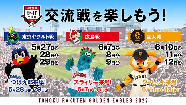 株式会社楽天野球団(本社:宮城県仙台市宮城野区、代表取締役社長:米田 陽介)は、5月27日(金)から楽天生命パーク宮城にて開催される「セ・パ交流戦2022」(東京ヤクルトスワローズ戦、広島東洋カープ戦、読売ジャイアンツ戦)において、3年ぶりのマスコット交流やPansonWorksとのコラボグッズ、交流戦を満喫できるお得なチケットを販売することとなりましたのでお知らせいたします。