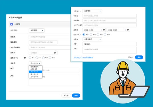 ユーザー管理者は、部署ごと、業務ごとに分かれるメタ情報のカテゴリーをあらかじめ設定しておくことができます。図面データ、生産データ、マーケットデータ、営業データなど、業務によって重要な検索キーワードが異なるためにカテゴリーを管理者が設定しておくことで、現場の社員達が各自データをアップロードする際に、簡単に、整理された状態でメタ情報を入力できるようになります。