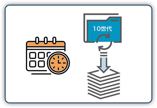 ファイルを最大10世代まで保存することができます。ファイルの上書きによるデータ喪失にも対応ができます。10世代すべてのバージョンを復元することができます。