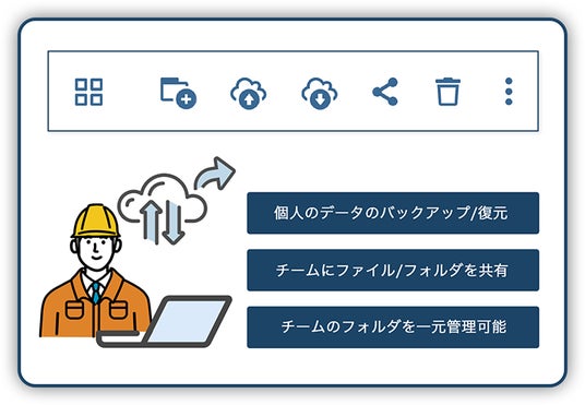 個人のデータ(ファルダーおよびファイル)をWebブラウザからアップロードして、クラウド上に保管できます。共有リンクとし て、アップロードしたデータを外部に共有可能です。(パスワー ド、期限設定可能)