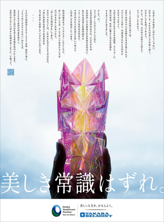 タカラベルモント株式会社(本社:大阪市中央区、代表取締役会長兼 社長:吉川 秀隆)は、2025年日本国際博覧会(以下、「大阪・関西万博」)の「大阪ヘルスケアパビリオン」への協賛出展にともない、企業広告を展開いたします。当社は、1970年大阪万博に続き2回目の万博出展となります。万博にかける思い、1970年から今に受け継がれる当社のDNAを、企業としてメッセージに込めました。今後は、大阪・関西万博期間中、各種媒体において順次掲載予定です。