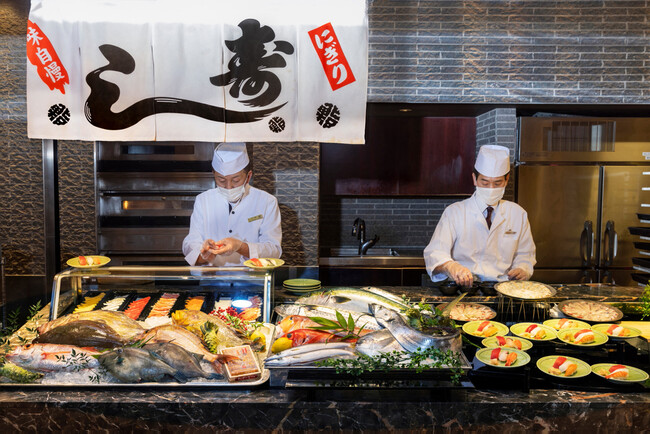 季節メニュー以外にも、ル・タンのディナーバイキングで定番人気のメニューもラインナップ。寿司職人が目の前で握るパフォーマンスと、産地直送の日替わりのネタが好評の握り寿司に加えて、ル・タン名物のローストビーフも登場。