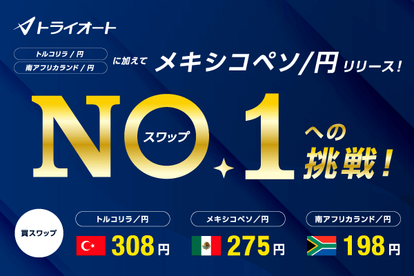 新たに追加された「メキシコペソ/円」や高金利通貨に代表される「トルコリラ/円」「南アフリカランド/円」でスワップNo1を目指してスワップポイントを提供いたします。