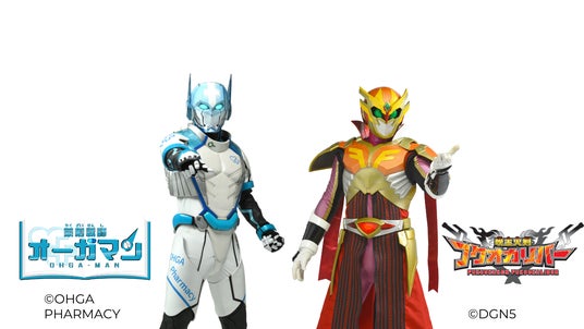 福岡初で福岡発の福岡を舞台とした本格特撮ヒーロー作品です。大賀薬局はオリジナルキャラクター「オーガマン」、キューサイは襟元にロゴを冠した「フクオカリバー」を中心にスポンサー企業として応援しています。