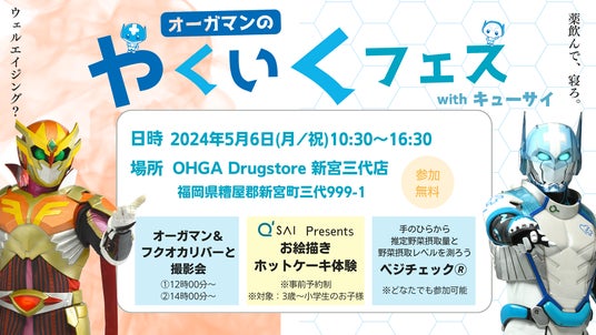 株式会社大賀薬局(本社:福岡市博多区、代表取締役:大賀 崇浩)とキューサイ株式会社(本社:福岡市中央区、代表取締役社長:佐伯 澄)は、コラボレーションをすることが決まりました。ご自身の健康について考えるきっかけにしていただくべく、合同イベントやコラボ動画の配信を行います。ゴールデンウィーク連休最終日にあたる5月6日(月・祝)に実施する「やくいくフェスwithキューサイ」を中心としたさまざまなコラボ企画をお楽しみください。