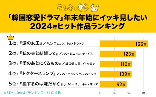 1位は、2024年にNetflixを通じて徐々に注目を集めていった『涙の女王』に決定!2位は、人気Webマンガを原作としたドラマ『私の夫と結婚して』がランクイン。3位~5位は僅差で順位が決定しました!