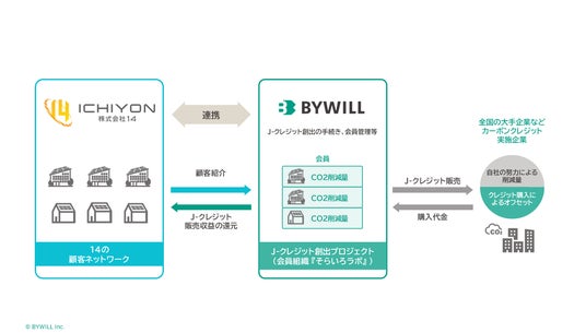 14は、個人家庭用と事業用に太陽光・蓄電池などを販売する事業を展開しており、バイウィルが運営する「太陽光発電設備の導入」によるJ-クレジット創出プロジェクト(会員組織名『そらいろラボ』)に関して、入会ニーズを有する法人企業と個人家庭をバイウィルに紹介する役割を担います。