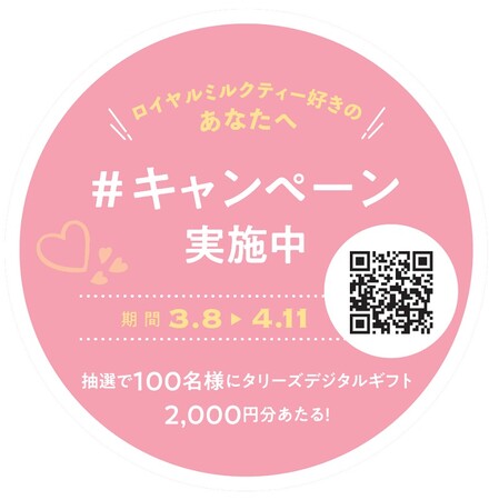 【内容】Twitter・Instagramでロイヤルミルクティーの好きなところを、「#タリーズロイヤルミルクティー」をつけて投稿すると、抽選で100名様にタリーズデジタルギフト(2,000円分)が当たります。