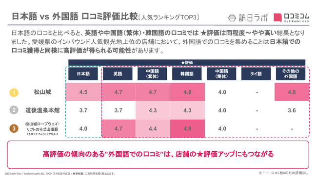 日本語の口コミと比べると、英語や中国語(繁体)・韓国語の口コミでは ★評価は同程度~やや高い結果となりました。愛媛県のインバウンド人気観光地上位の店舗において、外国語での口コミを集めることは日本語での口コミ獲得と同様に高評価が得られる可能性があります。