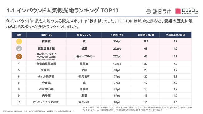 TOP10には城や史跡など、愛媛の歴史に触れられるスポットが多数ランクインしました。