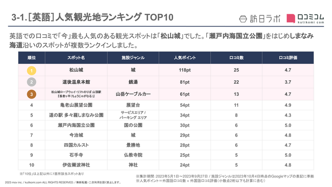 英語での口コミで「今」最も人気のある観光スポットは「松山城」でした。「瀬戸内海国立公園」をはじめしまなみ海道沿いのスポットが複数ランクインしました。