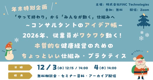 本ウェビナーは、健康経営コンサルタントが、従業員が楽しく主体的に健康行動をとるための具体的な仕組みや実践例(プラクティス)を解説する年末特別企画です。