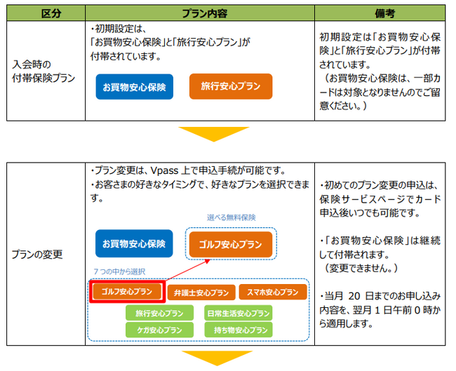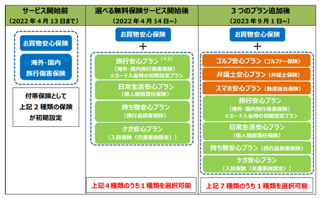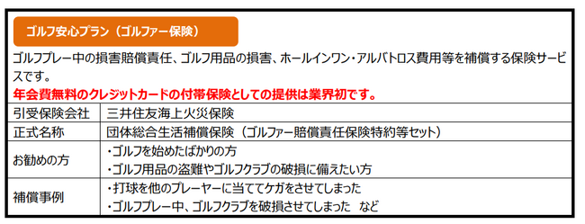 今般、さらに「ゴルフ安心プラン(ゴルファー保険)」、「弁護士安心プラン(弁護士保険)」、「スマホ安心プラン(動産総合保険)」の3つのプランを追加します。より一層、お客さまのあらゆるシーンでのトラブルにお応えできるサービスへレベルアップを図ります。なお、カード付帯保険は、「選べる無料保険」の他に、ショッピングを補償する「お買物安心保険」も提供しております。