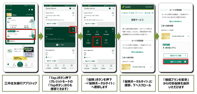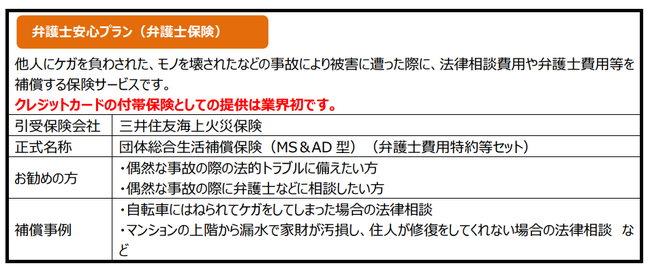 三井住友カードは、2022年4月14日より、国内初の、保険を選択できるカード付帯保険サービス「選べる無料保険」を提供しております。「選べる無料保険」は、従来の海外・国内旅行傷害保険だけでなく、身近なトラブルを補償したいというお客さまの声にお応えする、「日常生活安心プラン(個人賠償責任保険)」、「持ち物安心プラン(携行品損害保険)」、「ケガ安心プラン(入院保険(交通事故限定))」の4つのプランからお客さまが自由に選択できるカード付帯保険のサービスです。