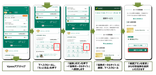 三井住友カード会員向け「Vpassアプリ」・三井住友カード会員向けサイト「Vpass」から、シームレスに「保険ポータルサイト」へアクセスし、付帯保険プラン変更のお手続きをいただけます。