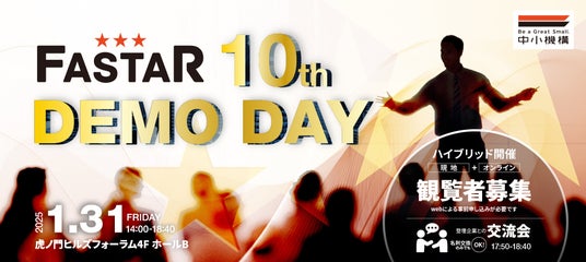 株式会社ツクリエ(本社:東京都千代田区 代表取締役:鈴木英樹 以下、ツクリエ)は、独立行政法人中小企業基盤整備機構(本部:東京都港区 理事長:宮川正 以下、中小機構)から運営を受託しているアクセラレーション事業「FASTAR」のピッチイベント「FASTAR 10th Demo Day(以下、本ピッチイベント)」を、2025年1月31日(金)に虎ノ門ヒルズフォーラムとオンラインで開催いたします。