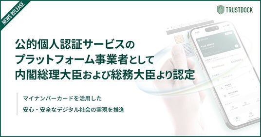 株式会社TRUSTDOCK(本社:東京都中央区、代表取締役:千葉 孝浩)は、公的個人認証サービスにおける署名検証者(プラットフォーム事業者)の主務大臣認定(※1)を、2025年9月26日付で取得したことをお知らせいたします。