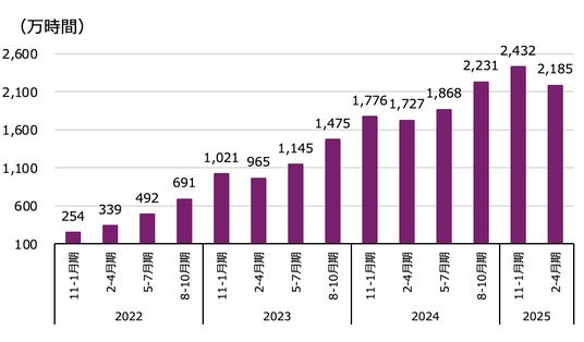 ・2025年2Q(2025年2-4月期)の延べ総労働時間(稼働実績)は2,185万時間(前年同期比+26.5%)