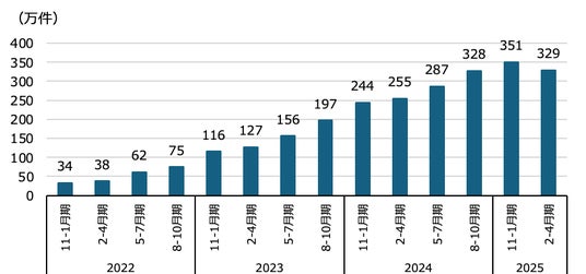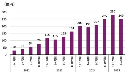 ・2025年2Q(2025年2-4月期)の総賃金額(実績)は249億円(前年同期比+30.4%)