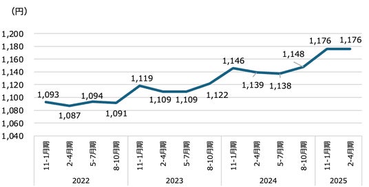 ・2025年2Q(2025年2-4月期)の三大都市圏のスポットワーク平均時給は1,176円(前年同期比+3.2%)