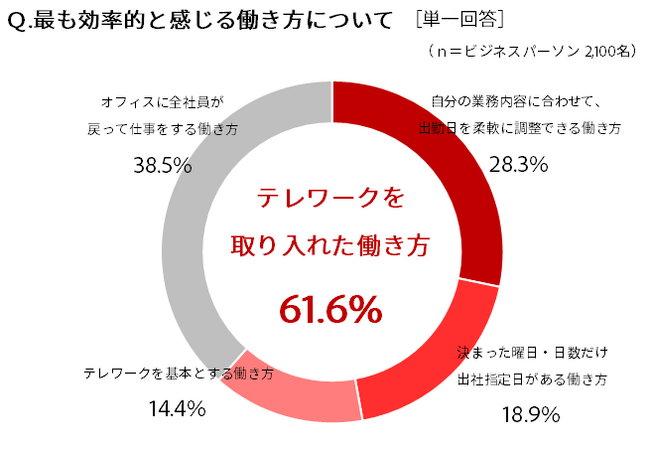 7都道府県で勤務するビジネスパーソン2,100名が最も効率的と感じる働き方は「テレワークを取り入れた働き方(61.6%)」と回答し、テレワーク未経験者も含めた6割以上のビジネスパーソンが、テレワークを望んでいることが分かりました。2020年からの新型コロナウイルスの流行により、テレワークという働き方がより広く定着し、「出勤日を柔軟に調整できる働き方」や「決まった曜日・日数だけ出社指定日がある働き方」など、柔軟に調整できるような働き方が効率的な働き方という意見も多数見られました。