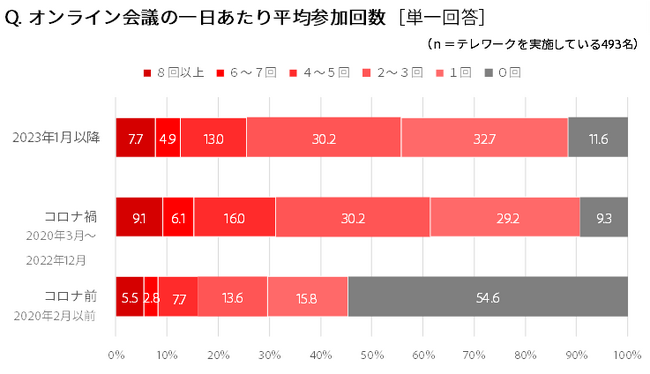 テレワークの利用を問わず、2023年1月以降では約42.2%のビジネスパーソンが、平均すると一日に1回以上、オンライン会議を利用しています。この結果は、コロナ前と比較すると約1.9倍となり、オンライン会議を日常的に業務に利用している人の割合が大幅に上昇していることがわかります。また、テレワーク利用者に絞ると約88.4%がオンライン会議を毎日利用、さらにテレワーク利用者の4人に1人、約25.6%は平均して一日あたり4回以上オンライン会議に参加しているという結果となりました。